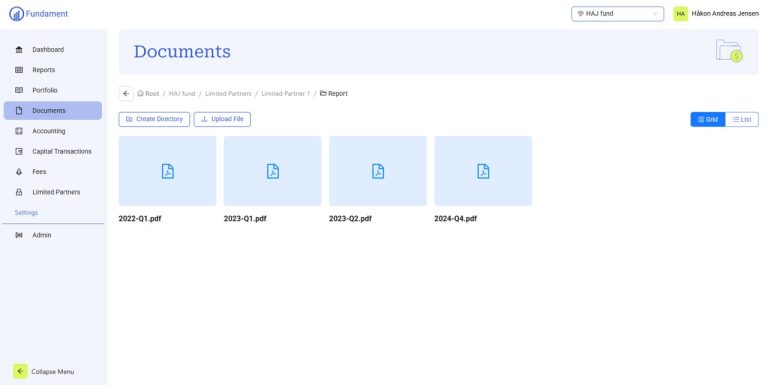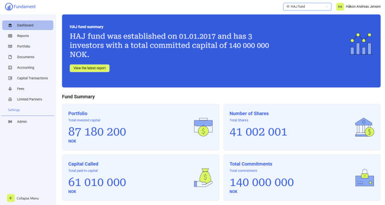 Fundament forenkler tidkrevende arbeid knyttet til fondsrapporteringen og forbedrer kommunikasjonen med dine investorer. Du får oversikt over hele din investeringsportefølje fra et oversiktlig grensesnitt som alltid er oppdatert. Du kan legge inn dine egne verdivurderinger, og dine investorer kan holde seg løpende oppdatert på porteføljen og verdiutviklingen. Systemet sender ut kvartalsrapportene for deg, og investorene har tilgang til alle transaksjoner og rapporter på tvers av fondene de har under forvaltning hos ditt selskap. Fundament brukes også til å forenkle prosesser knyttet til innhenting av kapital, for å sikre kvalitet og sporbarhet i transaksjonene, og til å møte alle krav og frister fra myndighetene.